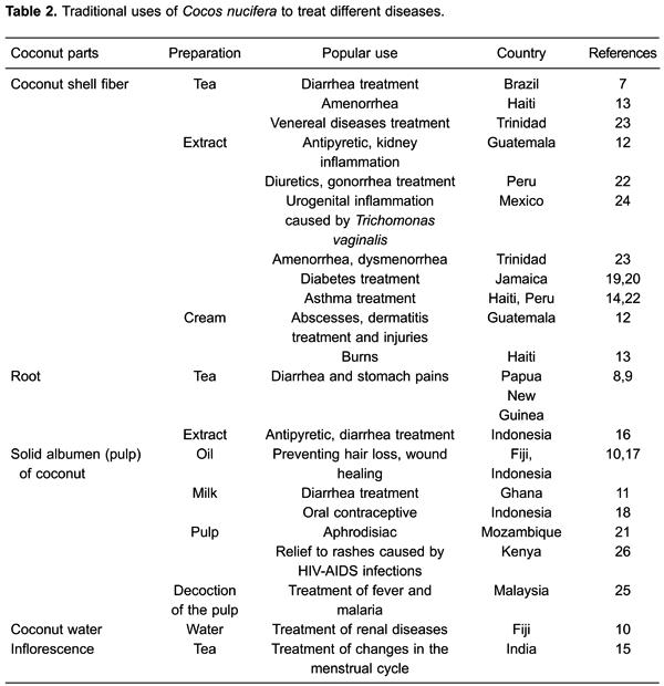 In Brazil, extract from the husk fiber of C. nucifera is used to treat diarrhea (7). In Papua New Guinea, the leaves and roots of young plants are chewed as treatment for diarrhea and stomachaches (8,9). In Fiji, coconut oil is used to prevent hair loss and coconut water is used to treat renal disease (10). In Ghana, people use coconut milk to treat diarrhea (11). In Guatemala, the husk fiber extract is used as an antipyretic, to reduce renal inflammation, and as a topic ointment for dermatitis, abscesses, and injuries (12). In Haiti, a decoction of the dry pericarp is used for oral treatment of amenorrhea, and the oil is applied as an ointment to burns (13); an aqueous extract from the husk fiber is also used for oral asthma treatment (14). In India, infusions made with the coconut inflorescence are used for the oral treatment of menstrual cycle disorders (15). In Indonesia, the oil is used as a wound ointment, the coconut milk is used as an oral contraceptive, and fever and diarrhea are treated with the root extract (16–18). In Jamaica, the husk fiber extract is used to treat diabetes (19,20). In Mozambique, the fruit is consumed by men as an aphrodisiac (21). Peruvians use the aqueous extract of the fresh coconut fiber orally for asthma, as a diuretic, and for gonorrhea (22). In Trinidad, bark extract is used orally for amenorrhea and dysmenorrhea, and bark tea is used to treat venereal diseases (23). In Mexico, coconut is used to treat various disorders associated with urogenital tract infection by Trichomonas vaginalis (24). A decoction of the white flesh of the fruit is used in rural Malaysia to treat fever and malaria (25). In Kenya, the fruit is used to relieve skin rash caused by HIV infection (26).For additional information click here